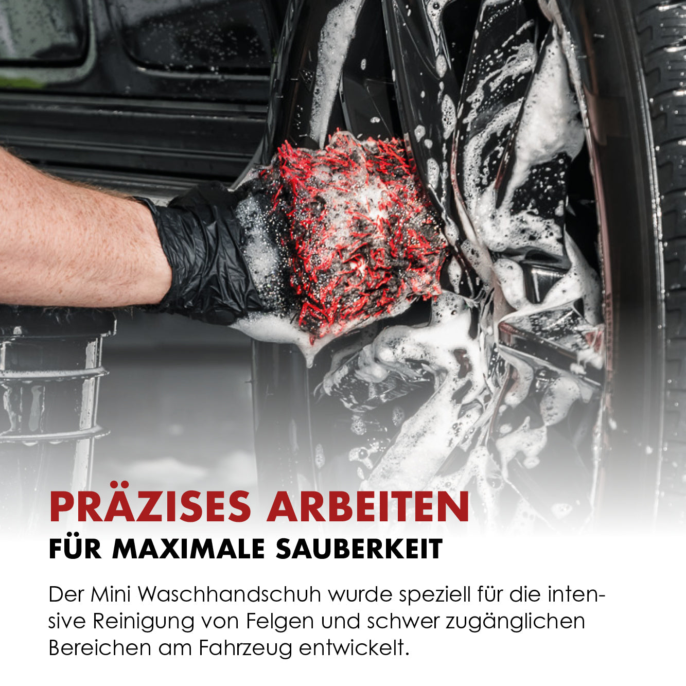 The Mini Wheel Wash Mitt combines the best of function and material: direct surface contact , soft microfiber , and optimal handling enable rim cleaning of the highest standard – in places where brushes can't reach. Professionals appreciate its efficiency, durability, and uncompromising cleaning results.