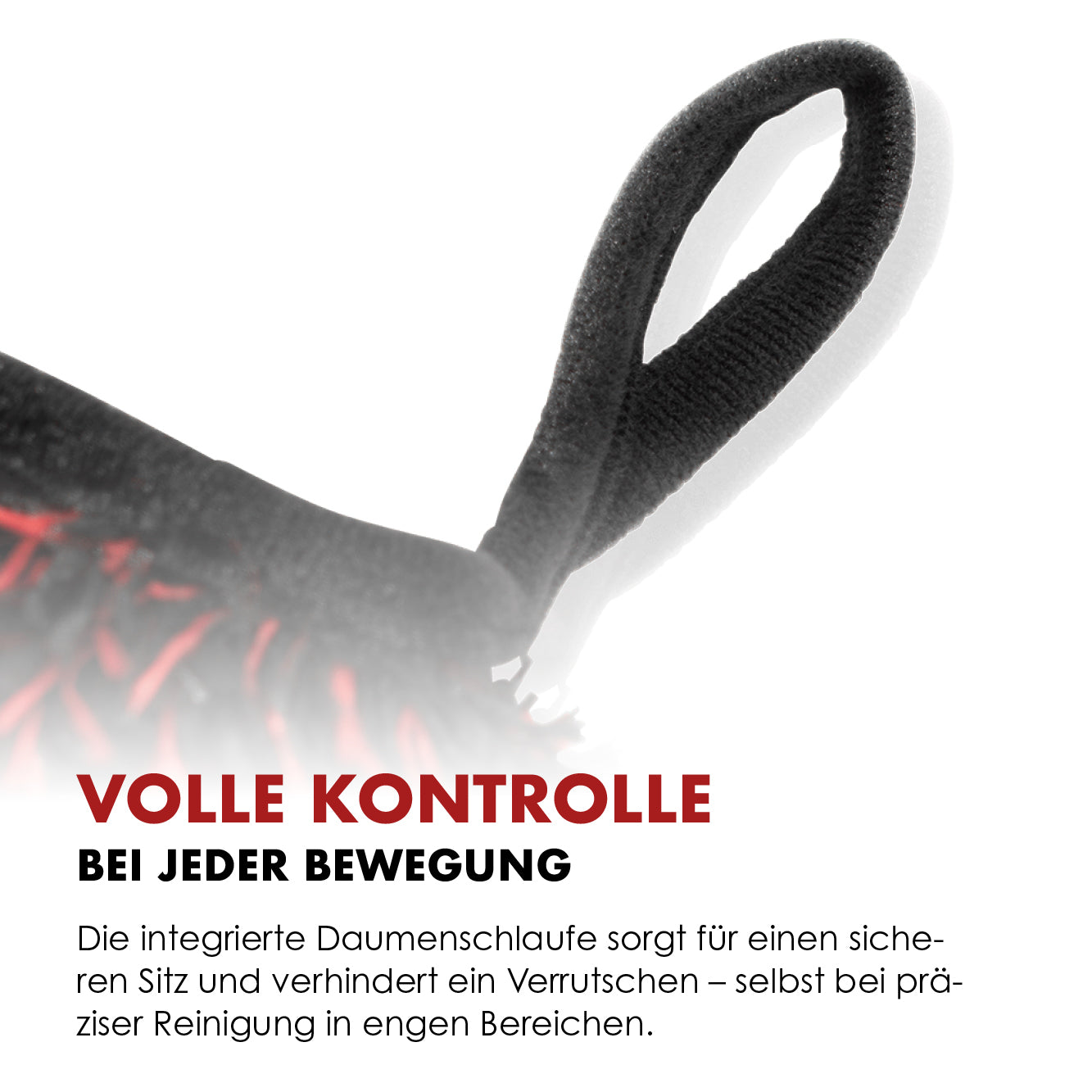 The high-quality, long-pile microfiber cleans effectively yet gently—ideal for delicate wheel surfaces. The integrated thumb loop ensures a secure grip, even with wet hands or when performing delicate work.