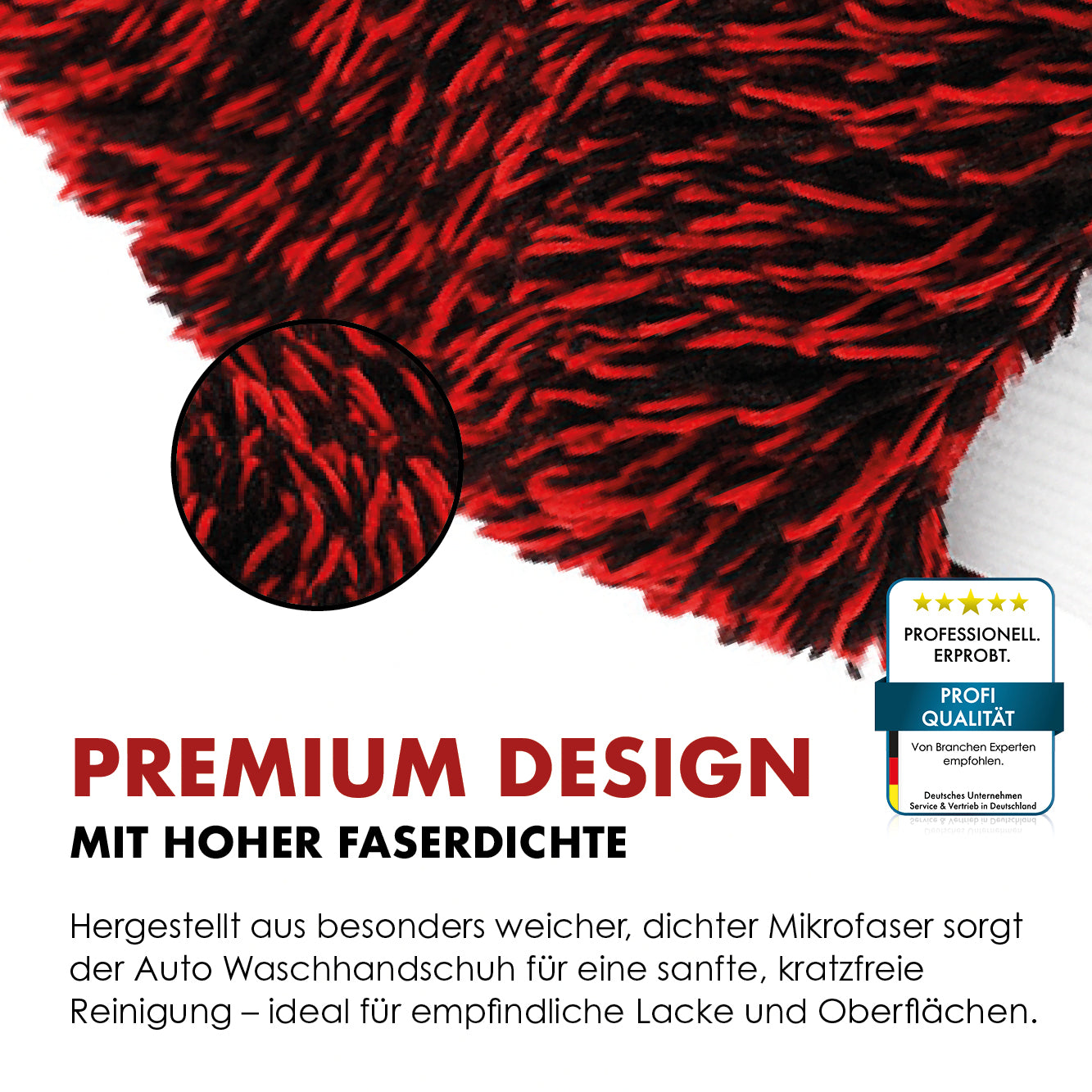 El guante de lavado para coches no solo destaca por su rendimiento, sino también por su elegante diseño negro y rojo. Su aspecto sofisticado refleja el estándar de calidad: perfecto para quienes valoran el estilo y el equipamiento profesional.
