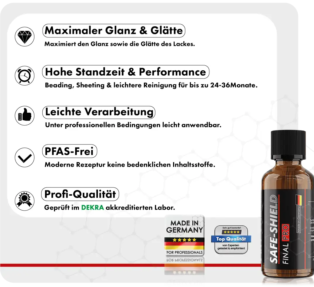 FINAL PRO no solo te garantiza ingredientes seguros y comprobados, sino también el máximo rendimiento: desde la suavidad de la superficie, el brillo intenso hasta una hidrofobicidad impresionante (efecto repelente al agua).