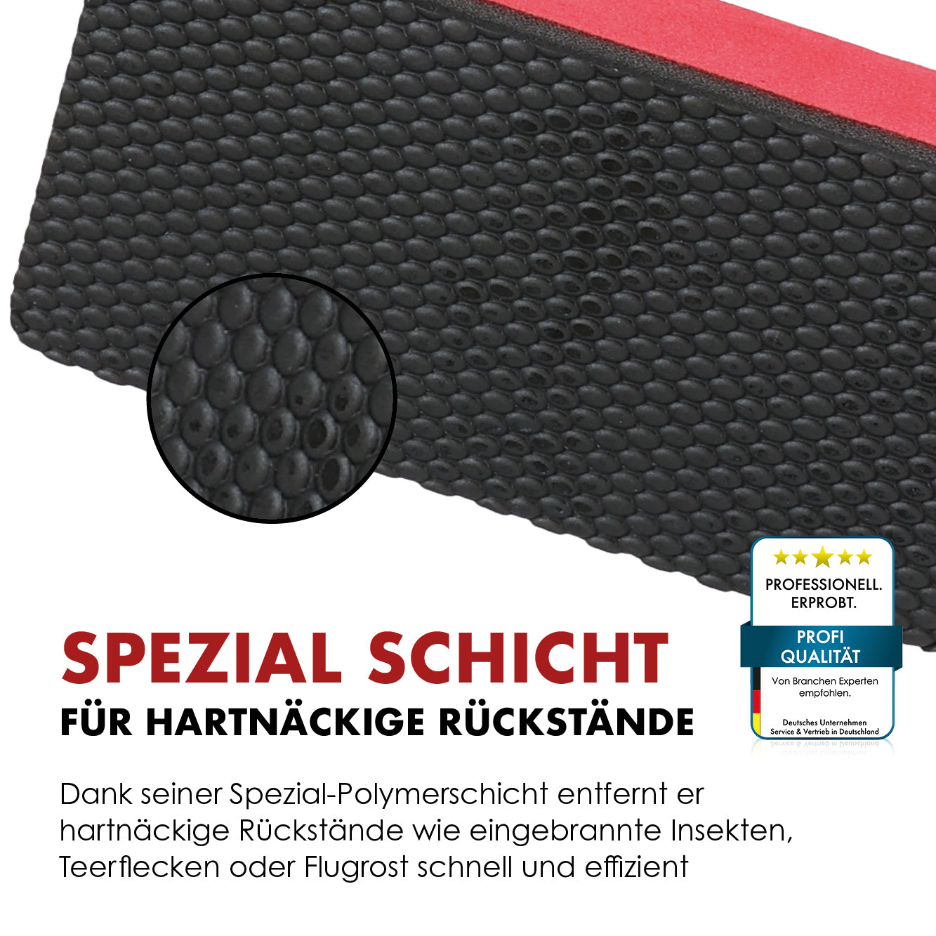 El revestimiento de polímero integrado de la esponja de arcilla elimina incluso la suciedad incrustada como óxido de hierro, alquitrán o restos de insectos, sin productos agresivos ni presión excesiva. Se desliza suavemente por la superficie y proporciona una estructura de la pintura visiblemente más lisa, sin arañazos. Ideal para profesionales que buscan eficiencia y seguridad.