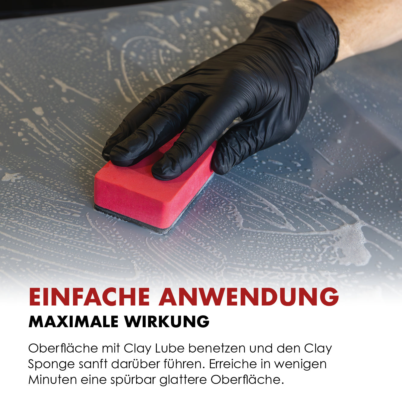 Simplemente humedece la superficie con Clay Lube o agua y desliza la esponja de arcilla sin presión sobre la pintura, el cristal o el plástico. Así eliminarás fácilmente incluso los residuos más persistentes, en pocos minutos y sin esfuerzo.